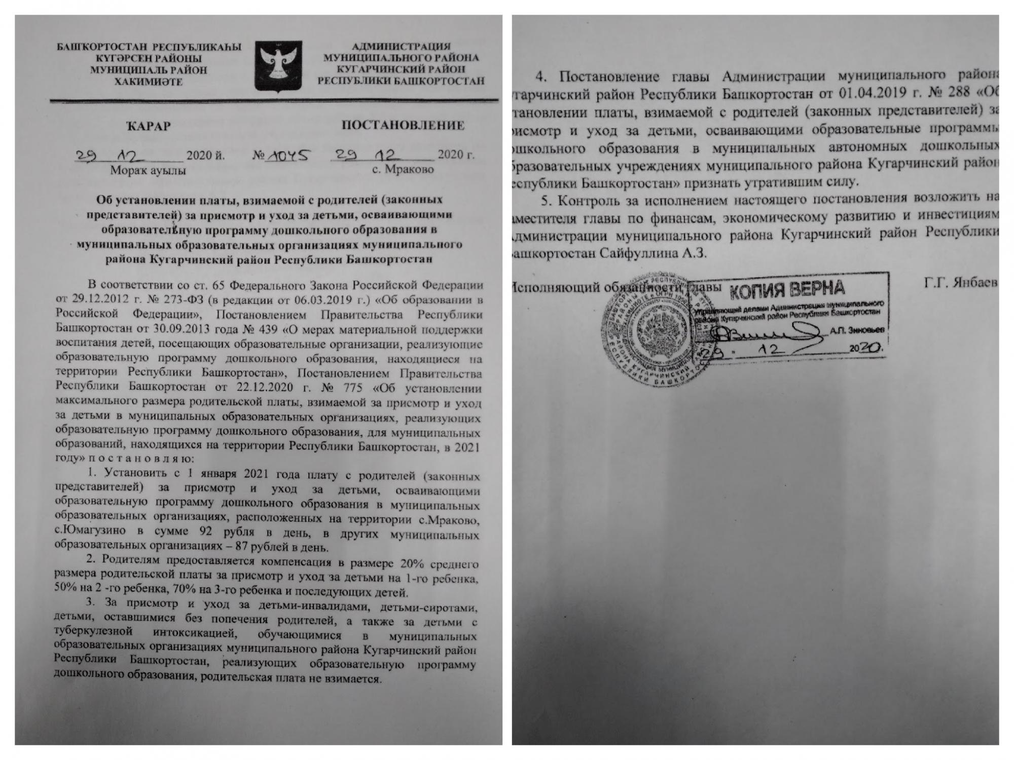 Документ об установлении размера платы, взимаемой с родителей (законных представителей) за присмотр и уход за детьми
